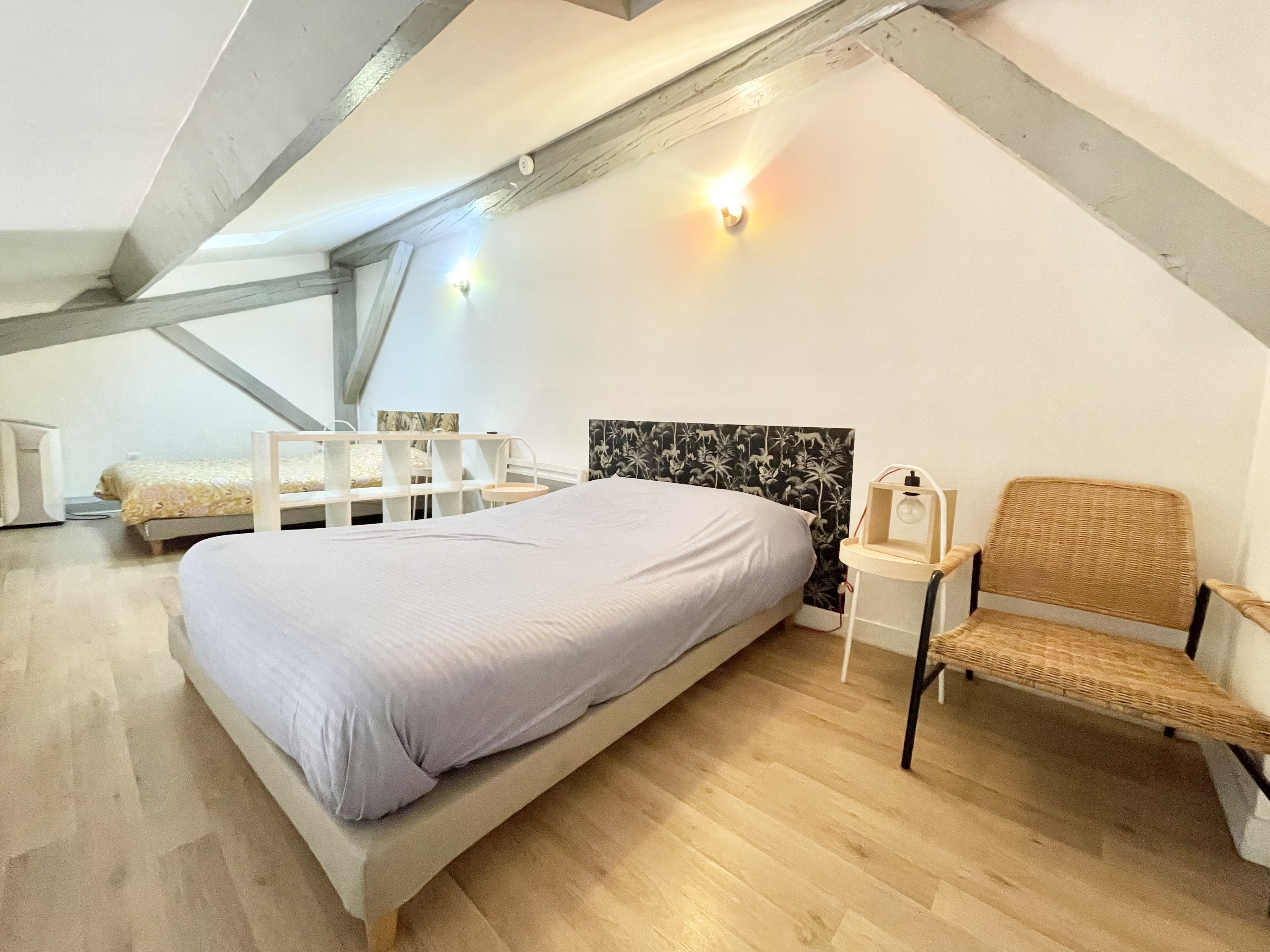 Il comprend une entrée, une pièce de vie avec cuisine ouverte, une salle d’eau avec wc et à l’étage une grande chambre (couchage + coin bureau).
